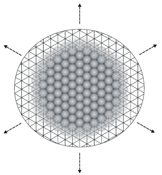 Triangular lattice representing a smooth metallic surface: Cu(111), Ag(111), or Au(111). Dotted arrows indicate the periodic boundary conditions imposed on the lattice.
