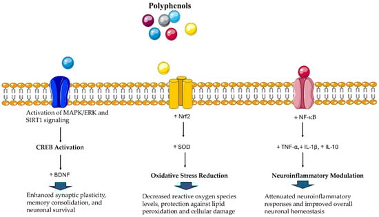 Table 1. Proposed biomolecular mechanisms dealing with the multifactorial action of polyphenols. CREB activation: polyphenols such as resveratrol and epigallocatechin gallate (EGCG) could stimulate MAPK/ERK and SIRT1 signaling, which in turn phosphorylate CREB and upregulate neurotrophins. This induces synaptic plasticity and sustains learning and memory. Oxidative stress reduction: through the activation of the Nrf2 pathway, polyphenols might potentiate the expression of antioxidant factors (e.g., SOD, catalase) that alleviate reactive oxygen species, thus protecting brain cells. Neuroinflammation modulation: by reducing the NF-κB pathway, polyphenols could depress the secretion of pro-inflammatory cytokines (e.g., TNF-α, IL-1β), decreasing neuroinflammation and potentially limiting neurodegeneration.