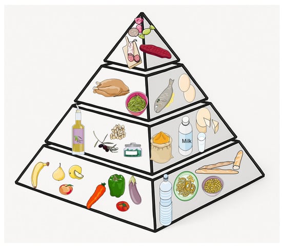 Figure 2. The Mediterranean diet is rich in polyphenols: fruits and vegetables, in particular berries, red grapes and red wine, green and black tea, cocoa, chocolate, olives and extra virgin olive oil. It is suggested to eat at least 2 portions of vegetables in the main meals with 1–2 portions of fruits and cereals. Nuts, seeds and olives (1–2 servings), but also milk and dairy products (2–3 servings), herbs and spices and olive oil (3–4 servings) should be consumed daily. Finally, weekly consumption of fish, crustaceans and mollusks (at least 2 servings), poultry (1–2 servings), eggs (2–4 servings) and legumes (at least 2 servings) is indicated. Meat, sweets, and cold cuts should be eaten sparingly (no more than 1 time a week). Water should be the main drink, but moderate consumption of wine is permitted. Servier Medical Art by Servier is licensed under a Creative Commons Attribution 3.0 Unported License (https://creativecommons.org/licenses/by/3.0/ accessed on 18 May 2025).