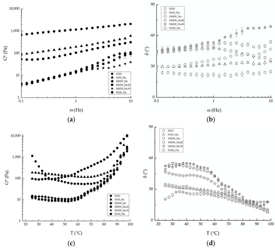 The SND_Ho sample exhibits similar characteristics to the SND sample, except for the decrease in modulus between 25 and 40 °C due to the substitution of butter with hemp oil. Samples with hemp flour and starch (HM50_Ho, HM50_Ho20, and HM50_Ho30) are all at the same consistency values and show an increase in modulus from 60 °C up to 100 °C. The HM100_Ho sample shows initial consistency comparable to that of the reference standards. In particular, the sample prepared with hemp flour and no starch (H100_Ho) achieves a sharp increase in this parameter at 60 °C.