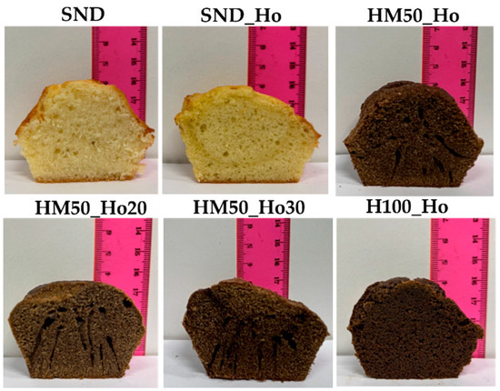 All the samples studied were baked to evaluate the characteristics of the finished product. Figure 2 shows images of the cooked samples and shows how the variation in ingredients used leads to different internal stratifications. It is observed that the low consistency of HM50_Ho, HM50_Ho20, and HM50_Ho30 samples leads to the formation of internal channels induced by the low batter structuring, which do not allow for a good retention of air in the matrix during baking and consequently the development of a homogeneous internal structure. In contrast, sample HM100_Ho shows a homogeneous, compact and uniform texture similar to the SND sample. Figure 2 visually confirms the rheological finding of low consistency in samples HM50_Ho, HM50_Ho20, and HM50_Ho30 until the structuring temperature. This low consistency promotes the formation of non-homogeneity.