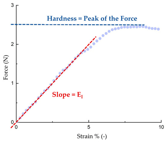 Puncture tests were performed using a tensile machine (Zwick-Roelle, ProLine Z005 TN, Ulm, Germany) equipped with a 5.0 kN load cell, to evaluate the mechanical resistance of baked samples in terms of elasticity index (EI). The elasticity index, on the other hand, can be calculated from the slope of the first linear section. The parameter provides information about the texture of the material. The hardness was quantified as the peak force recorded during the compression analysis, which can be interpreted as the force necessary for the initial bite [27,34]. An example graph for calculating the EI and hardness parameters is shown in Figure 5. All tests were performed at room temperature on baked samples that were allowed to stand for one hour after baking [35]. The specimens were compressed with a piston of area 35.7 mm2 (diameter = 6.74 mm) at a constant rate of 2 mm/s [35].