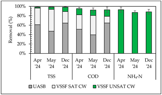 Pilot system efficiency (average ± SD) for the abatement of TSS, COD, and NH4-N (contribution of each subsystem to the overall removal). Error bars represent standard deviation of the total removal efficiency of the pilot system.
