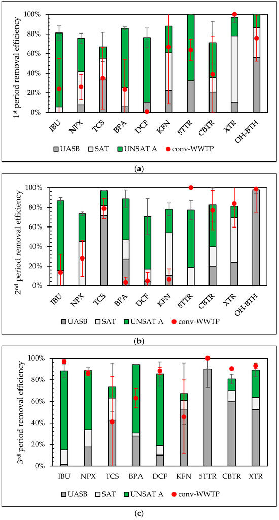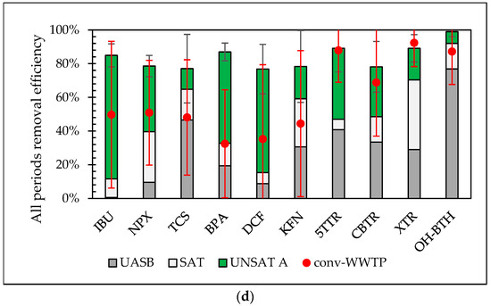 Contribution (average values) of UASB, VSSF SAT CW, and VSSF UNSAT CW (line A) to the target CECs’ removal efficiency of the pilot system in comparison with the removal efficiency of the conventional WWTP for the 1st (a), 2nd (b), and 3rd (c) periods, as well as for the whole monitoring period (d). Error bars represent standard deviation of the total removal efficiency of each system (pilot, conv-WWTP).