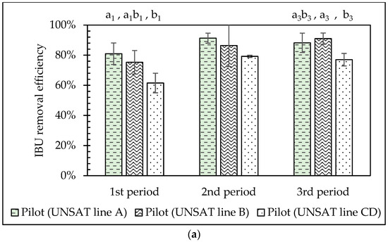 This section includes the results of the removal efficiency comparison for each period at each stage of the pilot system, along with a discussion of the potential removal pathways. The removal of each stage was calculated as a part of the total removal (contribution to the overall removal efficiency), according to Equation (2) (Section 2.7). ANOVA analysis showcased that there are no significant differences (p > 0.05) among the three sampling periods for UASB, VSSF SAT CW, and VSSF UNSAT CW (line A) for all EDCs and NSAIDs, revealing that the changes in HRT, OLR, SLR, and NLR in these units did not influence EDCs and NSAIDs removal. However, removal through the UASB unit was significantly (p < 0.05) higher during the 3rd period compared to the other two periods (1st and 2nd), respectively, for the target benzotriazoles: 5TTR, CBTR, and XTR, while OH-BTH removal was outstandingly higher (p < 0.05) during the 1st period than the 2nd. As far as VSSF SAT CW is concerned, significant differences in removal efficiency occurred between the 2nd period and the other two periods (1st and 3rd) for 5TTR, with enhanced removal during the 2nd period. Similarly, XTR removal showed significant differences between all periods, increasing in the order of 3rd < 2nd < 1st. OH-BTH removal differed significantly between the 1st and the 2nd periods. Statistically, there was no important difference in the removal efficiency of CBTR across the three periods at the SAT unit. It should be noted that OH-BTH was not detected at all in the 3rd period, neither in the influent, nor at any effluent. In the VSSF UNSAT CW, a significant decrease in the removal efficiency of 5TTR was observed during the 3rd period compared to the 1st and 2nd periods. Similar to the VSSF SAT CW, OH-BTH removal efficiency in the VSSF UNSAT CW differed significantly between the 1st and 2nd periods.