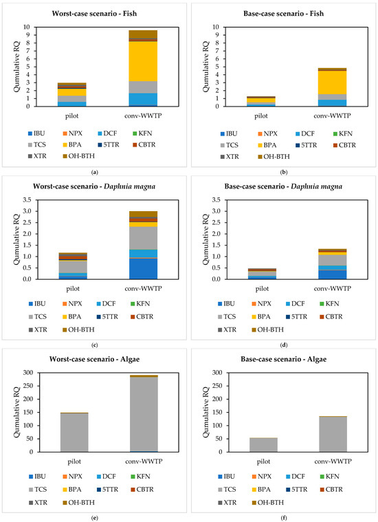 was associated with two scenarios. The first scenario was the base scenario, where was considered equal to the average measured concentration in the final effluent of each tested system (conv-WWTP, pilot-UNSAT A), which is more realistic. In the second scenario, which is the worst case, was set equal to the maximum measured concentration in the final effluent in each system. A dilution factor was not considered, given that the nearby water body is an ephemeral river and effluent is only diluted during the rainy season. value was obtained by dividing the lowest or value with an assessment factor of 1000 (Equation (4)), since short-term toxicity data were used. or values were found in the literature, where researchers either performed lab toxicity tests, or they used the ECOSAR prediction model [23]. More information about the values of or that have been used can be found in Supplementary Material (Table S4).