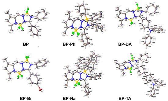 X-ray structures of BP [20], BP-Br, BP-Ph, BP-Na, BP-DA, and BP-TA. Displacement ellipsoids drawn at the 30% probability level.
