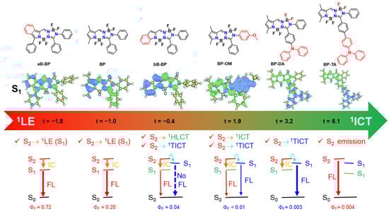 The adiabatic energy of the S₂ state was higher than that of the 1TICT state (see Figure 4 and Figure S11), suggesting the potential of an S2 → 1TICT internal conversion. However, in the cases of BP, BP-Br, BP-Ph, and BP-Na, the internal conversion from S2 (1LE) to S1 (1LE) dominated, resulting in population of the S1 state. Similarly, in aB-BP, the primary relaxation pathway involved the internal conversion from S2 (1HLCT) to S1 (1LE). In contrast, for bB-BP, BP-OM, and BP-DA, the S2 (1LE) → S1 (1TICT) internal conversion competed effectively with the S2 (1LE) → S1 (1ICT or 1HLCT) internal conversion, leading to the population of the 1TICT state. Notably, the 1TICT state adopted a twisted geometry in contrast to the planar configuration of the S2 and other S1 states. In BP-TA, the S2 state exhibited a purely LE character, as evidenced by the lowest t-index (−1.9 Å) among the BOPAM derivatives studied, indicating a high stability. This enhanced stability renders the S2 emission more favorable than the S2 → S1 (1LE, 1HLCT, 1ICT, and 1TICT) transitions [27,28]. Collectively, these findings highlight the significant role of the S2 state in facilitating the population of the 1TICT state via the S2 → 1TICT internal conversion. This, in turn, provides insights into the formation and behavior of the weakly emissive or non-emissive 1TICT (dark) state in BOPAM derivatives.