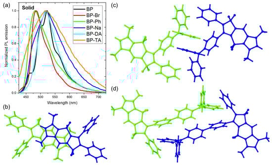 Prior to that, their absorption spectra were measured in the solid state. Those of BP-Ph, BP-Na, BP-DA and BP-TA consisted of a broad structureless band whose maximum was red shifted by 2000 ± 200 cm−1 versus toluene (Figure S12a). For BP [20] and BP-Br, the red shift of the maximum was less than 400 cm−1, but the absorption spectra showed on their red edge a shoulder at 460 and 455 nm, respectively, corresponding to a red shift of 3320 and 3150 cm−1 versus toluene. The shoulder and maximum are probably related to vibronic progression. While in the solid state the onset of all absorption spectra was red shifted, suggesting exciton interaction [29,30,31] between neighboring molecules, this red shift was less outspoken for the emission spectra. This can be related to the rigidity of the environment in the solid state or to exciton interaction between neighboring molecules, both leading to less structural relaxation in the excited state [32,33].
