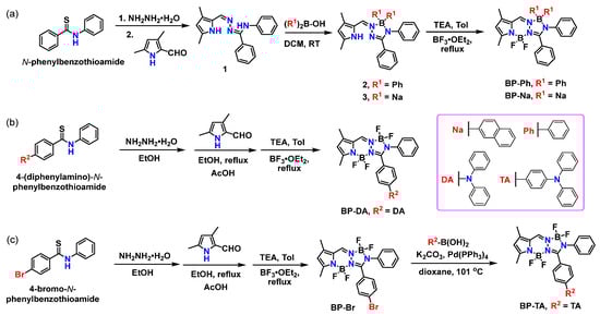 Synthetic route of (a) BP-Ph and BP-Na, (b) BP-DA, and (c) BP-Br and BP-TA.