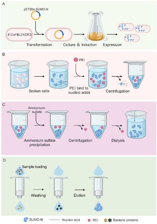 The expression and purification process of the full-length N protein. (A) The process of prokaryotic expression of the N protein. (B) PEI precipitates nucleic acid. (C) The enrichment of the N protein and removal of free PEI using ammonium sulfate precipitation. (D) N protein purification using a nickel column.