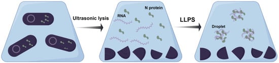 First, the collected bacteria were resuspended in conventional buffer B, and it was observed that the partitioned liquid was turbid. Even when these aggregates were removed through high-speed centrifugation, flocs slowly appeared in the supernatant, causing the solution to become sticky. These findings, in conjunction with previous experimental evidence, strongly suggested the occurrence of the LLPS phenomenon due to the release of bacterial nucleic acid because of the fragmentation and binding of the N protein to nucleic acid. Under low salt concentrations, the N protein can bind to nucleic acids, and the LLPS phenomenon occurs automatically [33,35]. The positively charged N protein has an electrostatic effect on negatively charged RNA/DNA, which drives the formation of condensates (Figure 2) [33]. When buffer A was used with a high salt concentration (1 M NaCl) to partition the suspension, the partitioned solution was clarified, and no obvious LLPS phenomenon occurred. Adding solid NaCl directly to the partitioned supernatant in which the LLPS phenomenon had occurred could reverse the LLPS phenomenon. These results indicated that increasing the salt concentration can prevent or weaken the formation of LLPS. Finally, the buffer containing 1 M NaCl was selected for ultrasonic fragmentation experiments.