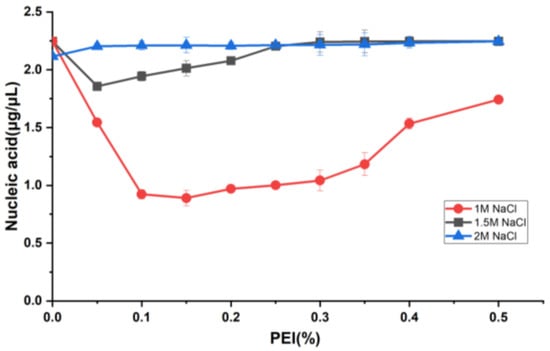 Each sample was introduced with 5% polyethyleneimine (PEI), yielding PEI concentrations corresponding to the NaCl concentrations, as follows: 0.05%, 0.1%, 0.15%, 0.2%, 0.25%, 0.3%, 0.4%, and 0.5%. Finally, the sample volumes were adjusted to match those of the buffer solution containing the corresponding NaCl concentration. The resulting mixtures were incubated at 4 °C for 30 min, followed by centrifugation at 15,000 rpm for 10 min. The subsequent determination of the nucleic acid content was conducted using the Nano100 instrument (Allsheng Allsheng Co., Ltd., Suzhou, China).