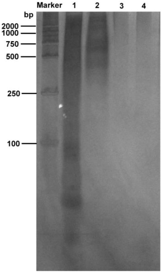 Silver staining results. M, marker; lane 1, the nucleic acid contained in the fragmented supernatant; lane 2, the residual nucleic acid contained in the fragmented supernatant after PEI treatment; lane 3, the residual nucleic acid in the sample after PEI, ammonium sulfate precipitation, and nickel column purification; lane 4, the control (buffer containing 50 mM Tris-HCl, 1 M NaCl, pH 8.0).