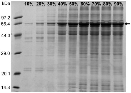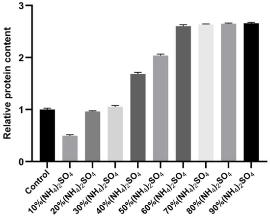 The ammonium sulfate precipitation method enriches the sample protein and also exerts a certain purification effect by reducing the nucleic acid content in the precipitated protein. In addition, certain free PEI molecules existing in the sample treated with PEI can interfere with the subsequent purification step using the nickel column, and the ammonium sulfate precipitation step removes these free PEI molecules. In order to study the relationship between the concentration of ammonium sulfate and the precipitation effect of the target protein, saturated ammonium sulfate solution was added to the sample containing 1 M NaCl after PEI treatment, in amounts that resulted in ammonium sulfate concentrations varying from 10% to 90% in increments of 10%. The sample was subsequently centrifuged at 4 °C for 2 h, after which the protein precipitate was resuspended in buffer C (50 mM Tris-HCl, 1 M NaCl, pH 8.0), followed by an SDS-PAGE analysis. The results revealed that the amount of N protein precipitated using ammonium sulfate increased with increasing ammonium sulfate concentration at a NaCl concentration of 1 M (Figure 5). At 60% ammonium sulfate concentration, the precipitation of N protein did not increase significantly, as no visible difference was observed on the gel map (Figure 6). Therefore, 60% ammonium sulfate was selected for enriching the target protein while removing the residual nucleic acid and PEI.