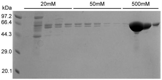 After treatment with ammonium sulfate, traces of free PEI may remain; therefore, the sample in this study was dialyzed and then passed through a nickel column to obtain pure N protein. After washing with 20 mM and 50 mM imidazole, pure N protein was obtained at a concentration of 500 mM imidazole (Figure 7). The purified samples were also subjected to silver staining. Pure N protein without nucleic acid contamination was obtained after performing the abovementioned purification steps (Figure 4, lane 3). In addition, the N protein was purified directly using a nickel column after crushing and centrifugation in buffer C (without PEI or ammonium sulfate treatment). Although the N protein was also obtained, the N protein precipitated in the subsequent dialysis step because the obtained N protein contained nucleic acid (Figure S1A). The N protein treated with PEI and ammonium sulfate did not precipitate (Figure S1B).