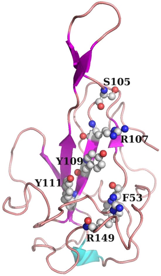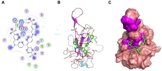 In order to elucidate the differential binding affinities of Light Green SF Yellowish to the N protein obtained using distinct expression systems, bioinformatic analyses were performed. The binding between LGSFY and the N protein was studied using molecular docking. The binding mode between LGSFY and the N protein is depicted in Figure 10. Within the binding pocket, two oxygen atoms on the sulfate radical of LGSFY formed salt bridges with the two nitrogen atoms of Arg92, and four oxygen atoms on the three sulfate radicals of LGSFY, regarded as hydrogen bond acceptors, formed three hydrogen bonds with the nitrogen atoms of Arg92, Arg107, and Arg149. The carbon atom of LGSFY formed an H–π conjugate with the benzene ring of Tyr109, and the benzene ring of LGSFY formed an H–π conjugate with the nitrogen atom of Ala156.