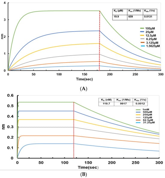 BLI is an unmarked, real-time optical detection technology that is primarily used for the omnidirectional quantitative analysis of biomolecule interactions. BLI allows for monitoring the entire intermolecular binding process in real-time and calculating crucial data, such as intermolecular affinity (KD), binding rate (Kon), and dissociation rate (Kdis). Several studies have successfully demonstrated the interactions between notable proteins and small molecules using BLI technology [45,46,47]. Therefore, in this study, BLI technology was used to determine the affinity between small molecules and the full-length N protein expressed in a prokaryote and then purified. Among the screened small molecules, Light Green SF Yellowish exhibited a good affinity for the N protein. The binding affinity KD was 19.9 × 103 nM (Table 1), suggesting that this protein is potentially a good inhibitor of the N protein (Figure 9A). The proteins produced in E. coli lack the post-translational modifications typically found in mammalian cells, such as complex phosphorylation and glycosylation modifications, and such deficiencies may directly alter the binding interfaces and thereby influence the screening outcomes of small-molecule inhibitors. Consequently, binding affinity assays between LGSFY and the N protein purified from human 293 cells (HEK293) were also performed (Figure 9B). Surprisingly, the binding affinity was determined to be 119.7 nM (Table 1), which is about an order of magnitude greater than that observed using prokaryotic expression of N protein (KD = 19.9 × 103 nM). This disparity in affinity could be attributed to the eukaryotic-specific modifications to the N protein, which may have altered the protein’s binding interface with LGSFY and potentially enhanced the interaction.
