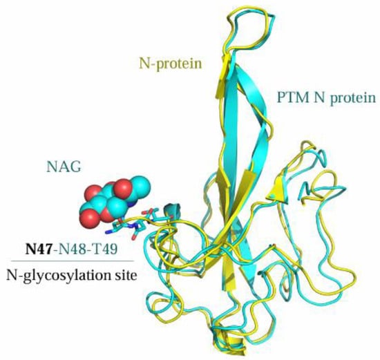 The sequence and structural alignment of the N-glycosylated N protein (cyan) and the unmodified N protein (yellow).