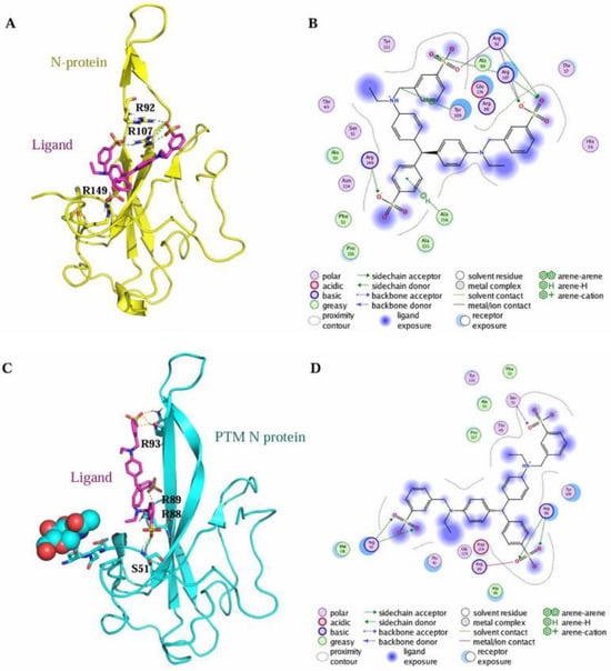 The characterization of the interaction between the N protein and the ligand Light Green SF Yellowish. (A) The docking pose of the ligand within the unmodified N protein (yellow). (B) The 2D interactions between the ligand and the unmodified N protein. (C) The docking pose of the ligand within the N-glycosylated N protein (cyan). (D) The 2D interactions between the ligand and the N-glycosylated N protein.