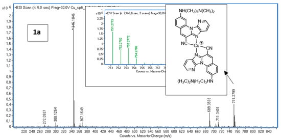 While the TIC spectrum predominantly shows the [1a2Cu]+ complex at m/z 751.2799, the formation of a [1aCu]+ species cannot be entirely excluded. No signals corresponding to a 1:1 complex were observed in the m/z 100–3000 range, suggesting that such a species, if formed, may be labile or present below the detection limit. Future studies with varied ligand-to-metal ratios or softer ionization techniques could further probe this possibility.