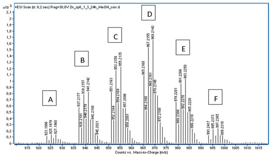 Part of the solution TIC spectrum of 1a and Zn(II) acetate in methanol, with signals indicating dinuclear complex ions A–F. The detailed signal assignation is presented in Table 1.