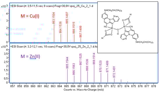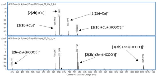 Electrospray ionization mass spectrometry (ESI-MS) is a powerful technique for characterizing metal coordination complexes. Yet, assigning the ESI mass spectra of such compounds can be challenging [], as the considerations involved differ significantly from those for purely organic samples. Metal complexes may lose or gain labile ligands, become oxidized or reduced, or react with oxygen or moisture, depending on the specific ESI conditions. Notably, the detection of fragile structures bound by weaker intermolecular forces is often limited in ESI-MS due to relatively harsh instrument conditions, such as high voltages or desolvation temperatures. In this work, ESI-MS analysis focuses on regioisomers 1 and 2 and analyzes their Cu(II) and Zn(II) binding affinities in detail, while computational DFT results provide a broader overview.