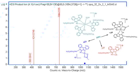 Compound 2b solely formed mononuclear complexes with Cu(II) and Zn(II) (Figure 4). Notably, a signal at m/z 1054 was detected, corresponding to a Zn(II) complex with three 2b ligands, despite the observed Zn:2b interaction ratio of 1:2. In contrast, complex ions with two ligands and varying counterion combinations were observed for molecules 1a, 1b, and 2a but not for 2b. The structures of these complex ions were proposed based on MS/MS experimental results, such as those for the m/z 1054 signal (Figure 5). The exclusive formation of mononuclear complexes by 2b, including the [Zn(2b)3]2+ species, contrasts with 2a’s ability to form both mono- and dinuclear complexes with Zn(II) and Cu(II). This is likely due to reduced steric hindrance in 2b, where the pyridine nitrogen orientation facilitates higher coordination numbers, and its higher basicity enhances charge delocalization. In 2a, steric constraints from the N8 pyridine nitrogen favor dinuclear complexes stabilized by counterion bridges, preventing the formation of a [Zn(2a)3]2+ complex.