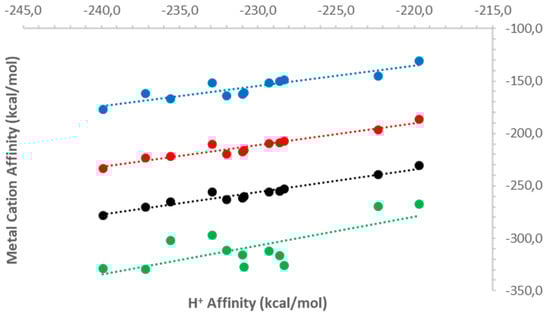 Correlation between proton and metal cation affinities in the gas phase (in kcal mol−1). Correlation coefficients (R2) are 0.83 (for Mg2+, in blue), 0.93 (for Ca2+, in red), 0.95 (for Zn2+, in black), and 0.54 (for Cu2+, in green).