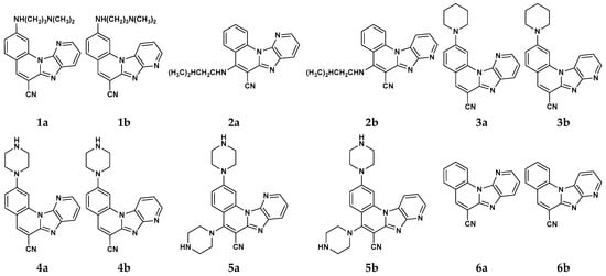 The molecules studied in this work include variously substituted tetracyclic organic compounds based on an imidazo[4,5-b]pyridine core fused to two phenyl rings. Their synthesis and evaluation of several biological properties were reported earlier [,], while here, we investigate their metal-binding properties using MS measurements and DFT calculations. Substituents, including nitrogen-bound and open-chain or cyclic moieties, were used to mono- or di-substitute the parent skeletons 6a and 6b. All compounds studied feature a strong electron-withdrawing 6-CN group, which counterbalances the electron-donating effects of the N-substituents, thereby tuning the binding affinities for metal cations. We also highlight a key structural feature: all compounds form pairs of regioisomers based on the position of the pyridine nitrogen (N8 or N11, denoted as Xa and Xb throughout the text). As discussed below, this subtle difference significantly alters ligand–metal cation interactions, offering a tool to tailor binding affinities for applications such as catalysis or metal ion sensing.
