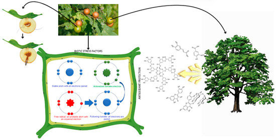 English oak (Quercus robur) from the beech family includes over 200 species that differ in morphology [1,2,3]. One of the interesting phenomena associated with English oaks is galls, which are formed on various morphological parts of the oak as a result of feeding insect larvae, including the larvae of the oak gall moth (Cynips quercusfolii, C. quercusfolii). These are abnormal growths of plant tissue formed on leaves, buds, flowers, and young branches due to stings and egg-laying by female C. quercusfolii [3,4,5]. They cause irritation, which leads to the overgrowth of regenerative tissue (callus). Galls act as a shelter and food source for larvae and are characterized by a high tannin content, which can constitute up to half of the dry weight of the gall. The presence of galls can contribute to increased oxidative stress [6], during which the host plant is exposed to the additional production of free radicals (reactive oxygen species, ROS). Physiologically, ROS are important signaling molecules leading to increased cell proliferation, differentiation, and maturation [7]. ROS plays an important role in immune responses and immunometabolism, during which the production of antioxidant compounds is intensified. Antioxidants include bioactive metabolites, including phenolic acids, flavonoids, and tannins (Figure 1). Therefore, historically, galls of Quercus sp. have been used as traditional remedies in the treatment of inflammatory conditions, including diarrhea and dysentery, abdominal pain, toothache, and tooth decay, as well as in postnatal care and in the fight against metabolic abnormalities and diseases related to oxidative stress [8,9,10]. Pharmacologically, Quercus sp. galls have antibacterial, antioxidant, anti-inflammatory, anticancer, antifungal, antiviral, antiprotozoal, antiamoebic, antiulcer, larvicidal, tooth and gum tonic, antidiabetic, cardioprotective, hepatoprotective, antiparkinsonian, antitumor, and wound healing properties [1,9,11,12,13,14,15]. Despite its numerous therapeutic properties, the long-term use of galls is not recommended as they may cause side effects such as irritation of the gastric mucosa, nausea, and vomiting [16]. In addition to its medicinal uses, the industrial use of Quercus sp. galls dates back to ancient times, with the galls being used for tanning leather, as a coloring agent for paintings, and as natural dyes for carpet yarns, respectively, as a component of ink. Galls of the Quercus sp. genus are characterized by a high tannin content (50–70%) [2,11]. In addition to tannins, the diverse phenolic profile mainly includes numerous flavonoids and simple phenolic compounds, such as phenolic acids, hydroxyphenols, and coumarins, and in smaller numbers, representatives of other groups of phenolic compounds, i.e., phenolic aldehydes, naphthodianthrones, acylphloroglucinols, phenolic alcohols, and stilbenes [17,18,19] However, their most valuable substance is gallic acid, which belongs to the group of phenolic acids. An analysis of the polyphenol content of plant-based raw materials is important from the point of view of searching for new sources of these compounds, qualitative assessments, and assessments of the level of oxidative stress to which the plant is exposed. Galls are an example of an interaction between an insect and a plant. So far, the literature indicates that the intensification of gallic acid biosynthesis is local [20,21,22]. Based on our own experiences and the immune mechanisms of other plants, it is known that even a local infection can affect the metabolism of the entire plant. Based on these premises and the fragmentary knowledge on this subject, we decided to conduct preliminary studies.
