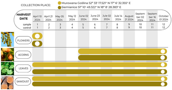 During the study, chemical analyses were performed to determine the content of biofunctional metabolites in various anatomical parts of the English oak at two-week intervals from flowering to full acorn maturity (Figure 2).