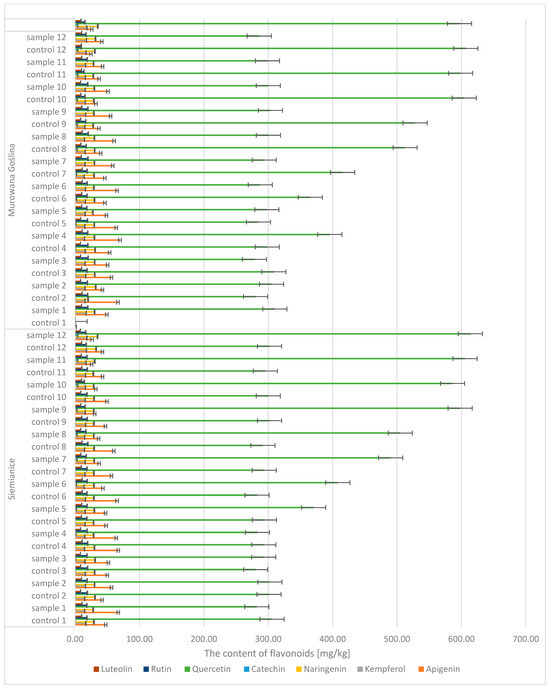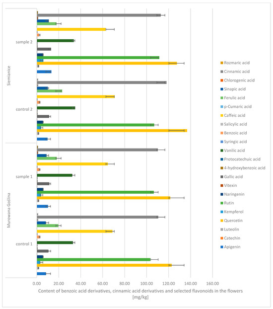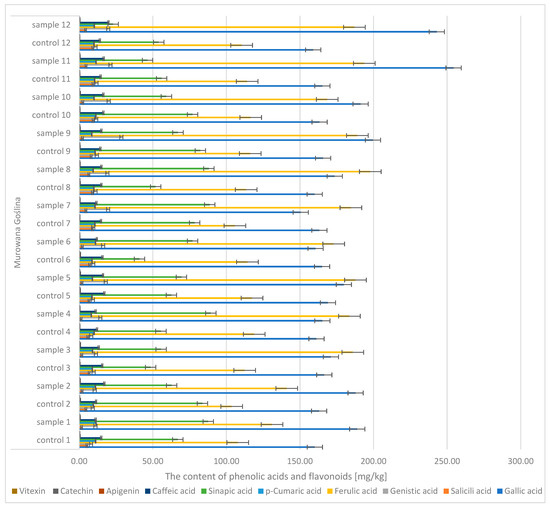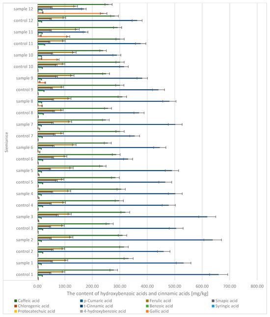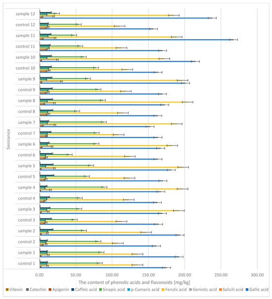 Due to the chemical structure and properties of phenolic compounds, they were divided into three main groups: benzoic acid derivatives, cinnamic acid derivatives, and flavonoids (Figure 4). Among benzoic acid derivatives, vanillic acid was found to have the highest content. Its content was 68–71%. In turn, among all cinnamic acid derivatives, the highest content was found for cinnamic acid. Its content was 53–55% (CONTROL: 110–118 mg/kg d.m. (dry mass); sample: 112–118 mg/kg d.m.), and the caffeic acid content was 31–33% (CONTROL: 68–70 mg/kg d.m.; P: 62–64 mg/kg d.m.). In turn, during the analysis of flavonoids, the highest content was noted: quercetin, i.e., 48–52% (CONTROL: 122–136 mg/kg d.m.; SAMPLE: 122–127 mg/kg d.m.), rutin, i.e., 40–43% (CONTROL: 103–106 mg/kg d.m.; SAMPLE: 106–111 mg/kg d.m.). The lowest values were recorded for the following: syringic acid (CONTROL: 0.13–0.23 mg/kg d.m.; SAMPLE: 0.16–0.24 mg/kg d.m.), p-coumaric acid (CONTROL: 0.09–0.11 mg/kg d.m.; SAMPLE: 0.11 mg/kg d.m.), catechins (CONTROL: 0.02–0.03 mg/kg d.m.; SAMPLE: 0.02–0.03 mg/kg d.m.), and vitexin (CONTROL: 0.13–0.18 mg/kg d.m.; SAMPLE: 0.14–0.24 mg/kg d.m.).