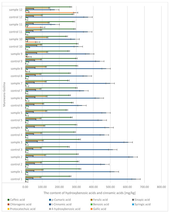 The contents of hydroxybenzoic acids and cinnamic acids in the leaves of the English oak, Murowana Goślina; sample—tree with galls; control—healthy tree.