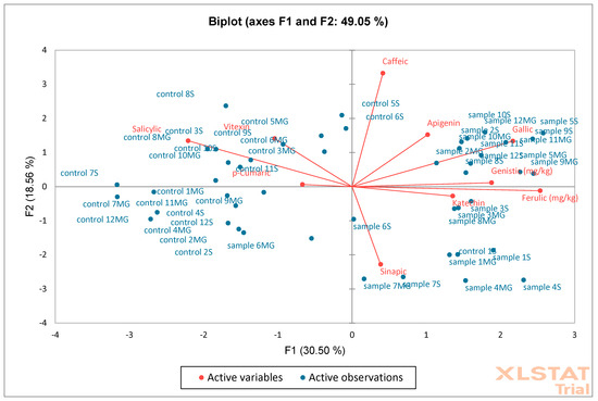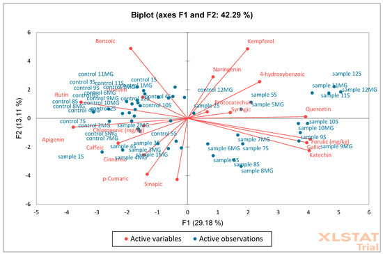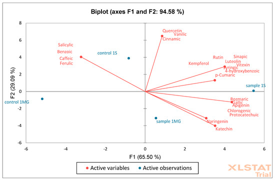 Principal Component Analysis (PCA) was performed on oak flower samples (S—Siemianice, MG—Murowana Goślina). Red arrows represent phenolic compounds, and blue points are samples: sample 1MG, sample 1S—represents experimental samples, control 1MG, control 1S—control samples.