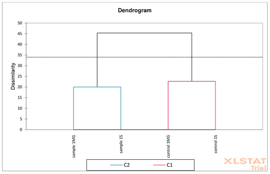 Based on the obtained results, PCA (Principal Component Analysis) and AHC (Aggregation Grouping Analysis) were performed on oak flower samples (Figure 12 and Figure 13). The PCA graph presents the analysis of two principal components: F1 (65.50%) and F2 (29.09%). Together, these two components explain 94.58% of the data variability, which indicates very good representativeness of the PCA model. Red arrows represent phenolic compounds, e.g., quercetin, catechin, p-cumaric, naringenin, etc. The direction and length of the arrows show the strength and direction of the influence of a given variable on the F1 and F2 components. Variables such as catechin and naringenin strongly correlate positively with the F1 axis. Quercetin and kaempferol have a large contribution to F2. Blue points are samples: sample 1MG, sample 1S—represents experimental samples, control 1MG, control 1S—control samples. Sample 1S and sample 1MG are located on the right side of the F1 axis—they show higher levels of compounds such as catechin and naringenin. Samples control 1S and control 1MG are located more on the left side—they have higher associations with other phenolic compounds, e.g., syringic acid and salicylic acid. A clear separation of control and experimental samples was observed, which may indicate a difference in the phenolic composition.