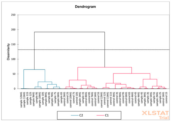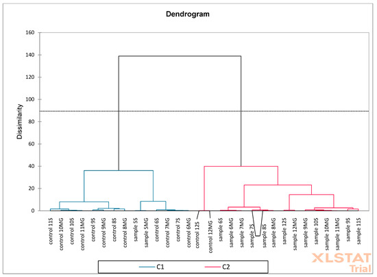 The next analysis performed was PCA (Figure 16) and AHC (Figure 17) on oak acorn samples. Based on the obtained results, it was found that the F1 (56.09%) and F2 (17.55%) axes together explain 73.64% of the total variability in the data, which is a relatively high value. Red arrows represent active variables (e.g., content of phenolic compounds such as catechins, tannic acid, ellagic acid, gallic acid, etc.). Blue points are active observations—samples marked as “control” and “sample” with numbers. Control samples are concentrated mainly on the left side of the F1 axis, which means that they have low values for variables related to the contents of phenolic compounds. Samples are mainly distributed on the right side—they show higher values of compounds such as the following: (+)-catechin, m-digallic acid, gallic acid, (−)-epicatechin gallate, etc. AHC analysis shows a fixed cut-off level (dotted line), which indicates two main groups (clusters): C1 (blue)—contains mainly control samples and several samples (with galls) with similar chemical profiles, C2 (pink)—contains mainly samples (with galls), which differ significantly from the control, suggesting that they have been modified or have a different phenolic composition. Control samples are more homogeneous—they cluster together in compact groups at a low dissimilarity value. Samples (with galls) form a separate cluster, indicating significant differences in the phenolic content (also confirmed via PCA). PCA shows that samples (with galls) differ from “control” mainly due to higher concentrations of some phenolics. AHC confirms this difference by dividing the samples into two main groups: control and test. Both analyses show a clear separation between control and modified/test samples.