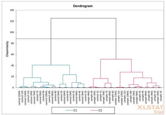 The last analysis performed was PCA (Figure 18) and AHC (Figure 19) on oak sawdust samples. The results showed that the F1 (30.50%) and F2 (18.55%) axes together explain 49.05% of the total variability in the data. The F1 axis reflects the largest differences between samples and controls. The F2 axis shows additional variability, but less than F1. Most of the controls are on the left side of the graph (F1 negative), while the samples are on the positive side, suggesting significant compositional differences between groups. The phenolic compounds vectors (e.g., caffeic, apigenin, genistic) indicate which compounds influence the discrimination between groups. Compounds such as ferulic, genistic, catechin, apigenin, and caffeic are more associated with samples than with controls (directed towards “sample”). The AHC analysis showed a clear separation of two main clusters indicating significant differences between samples and controls. PCA confirms that the phenolic composition distinguishes samples from controls, with key compounds including ferulic, caffeic, and catechin. AHC shows that control and samples form two distinct clusters, confirming the consistency of the PCA results. Together, both analyses indicate a significant difference between controls and samples, which may suggest an effect of the factor/intervention being studied on the phenolic composition.