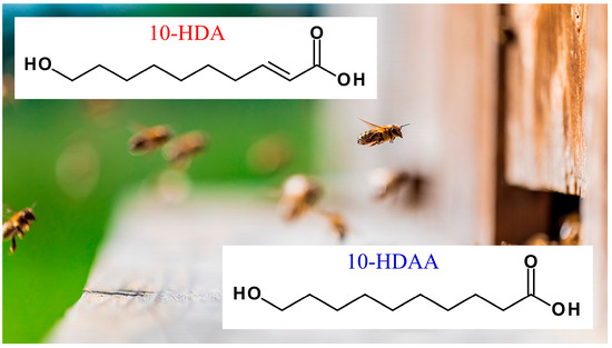 In addition, it has been observed that the 10-HDA molecule is fundamental for the development of larvae and the longevity of the Queen bee, but only the 10-HDAA molecule seems to be responsible for the immune-stimulating effect attributed to Royal Jelly, as described in Section 3.1. The molecular structures of 10-HDA and 10-HDAA are reported in Figure 2.