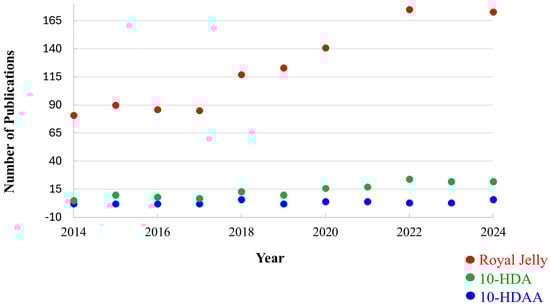 The number of documents obtained for the period 2014–2024 when searching the database Scopus for Royal Jelly, 10-hydroxy-2-decenoic acid, and 10-hydroxydecanoic acid.