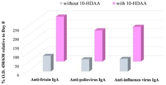 The potential role of 10-HDAA in supporting Microfold cell differentiation and promoting an antigen-specific immune response was first reported by Misumi et al. [36]. Three different enteric-coated capsules, consisting of fetuin (a), inactivated antigens from poliovirus (b), and influenza virus (c), were orally administrated with or without 10-HDAA to cynomolgus macaques. The enhanced IgA level was monitored via stool samplings 12 and 21 days after administration by measuring the absorbance at 450 and 630 nm (O.D. 450/630). The data were expressed as percentage O.D. on days 12 and 21 relative to the value observed on day 0. The results indicate that the production of IgA in the conditions investigated was enhanced on day 12. Moreover, an antigen-specific mucosal response was strongly promoted by the 10-HDAA treatment in all cases. The data obtained on day 12 with and without 10-HDAA in the immunized macaques against fetuin, poliovirus, and influenza virus are reported in Figure 4.