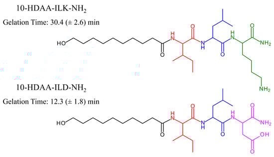 Chemical structures and gelation times of 10-HDAA-ILK-NH2 and 10-HDAA-ILD-NH2. The moieties of the single constituents are depicted in different colors as follows: black for 10-HDAA; red for isoleucine; blue for leucine; green for lysine; and pink for aspartic acid. Data are from [59].