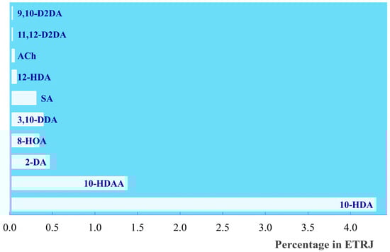 Percentage contents of the investigated components in ETRJ: 9,10-D2DA (9,10-dihydroxy-2-decenoic acid); 11,12-D2DA (11,12-dihydroxy-2-dodecenoic acid); ACh (Acetylcholine); 12-HAD (12-hydroxydodecanoic acid); SA (sebacic acid); 3,10-DDA (3,10-dydroxydecanoic acid); 8-HOA (8-hydroxyoctanoic acid); 2-DA (2-decenedioic acid); 10-HDAA (10-hydroxydecanoic acid); and 10-HDA (10-hydroxy-2-decenoic acid). Data are from [68].