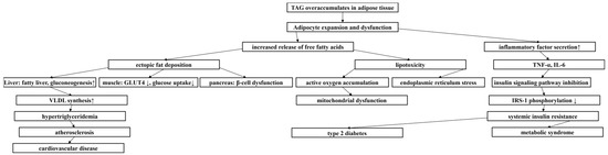 Obesity, as a nutritional metabolic disorder [1], has been listed as a global health crisis by the WHO [2], with its escalating prevalence highlighting the urgency for the prevention and treatment of obesity. The pathological features of obesity are characterized by abnormally elevated levels of triacylglycerol (TAG) in plasma (Figure 1), resulting in excessive accumulation and abnormal distribution of adipose tissue [3], and then overweight. Body mass index (BMI) is the most commonly used powerful indicator to evaluate the degree of overall obesity. A BMI of 24.0–27.9 kg/m2 is defined as overweight, and BMI of 28.0 kg/m2 or higher is defined as obesity. Waist circumference (WC) is a simple index to determine abdominal visceral obesity. The defined parameters of Chinese adults are male waist circumference of 90 cm and female waist circumference of 85 cm [4]. Visceral adiposity index (VAI) is an obesity index that can reflect visceral fat function. The formation and development of obesity involves the combined effects of multiple factors such as heredity, social environment, and lifestyle. In particular, the lifestyle of sedentary and excessive energy-intensive food intake makes food-borne obesity extremely prominent [5], which promotes the rapid growth of the incidence of obesity, a chronic metabolic disease. Obesity is not only a major risk factor for stroke, cardiovascular disease, and a variety of malignant tumors (such as esophageal adenocarcinoma and colorectal cancer), but it is also closely related to metabolic syndrome [6]. The high prevalence of obesity not only poses a serious challenge to global healthcare systems, but it has also become an urgent economic and social problem to be solved.