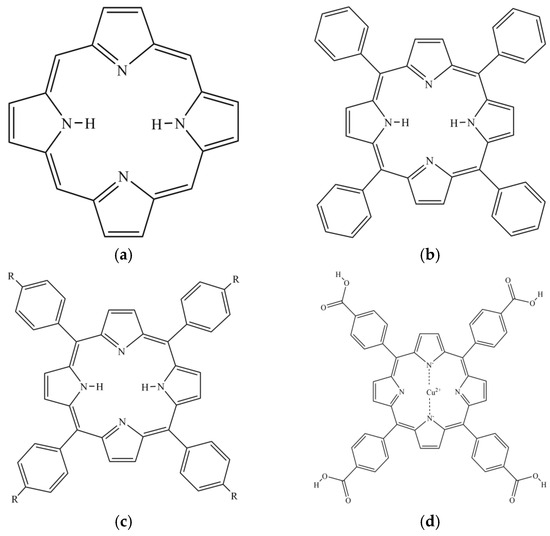 Structural formula of (a) Porphyrin; (b) TPP; (c) TAPP: R = NH2, THPP: R = OH, TCPP: R = COOH; (d) Cu-TCPP.