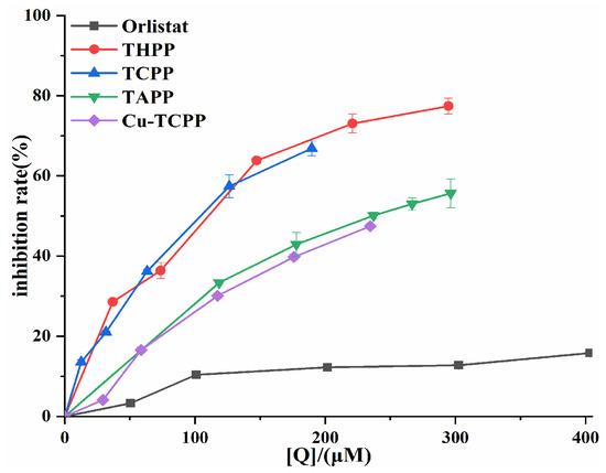 A total of 250 mg pancreatic lipase was dissolved in 50 mL ultrapure water. After centrifugation at 5000 r/min for 10 min, the supernatant was taken. Then, 80 mg of 4-nitrophenyl laurate was dissolved in 100 mL of 5 mmol/L sodium acetate solution (pH 5.0, containing 1% triton x-100), and dissolved in a boiling water bath. After cooling to room temperature, it was set aside. Appropriate amounts of TCPP, THPP, Cu-TCPP, and TAPP powders were dissolved in DMSO (final concentrations of 2%, 2%, 5%, and 10%, respectively), and then diluted to different concentrations by adding chromatographic methanol and stored in brown reagent bottles in the dark. The blank sample solutions were chromatographic methanol solutions containing 2%, 5%, and 10% DMSO. Orlistat was prepared from the blank sample solution.