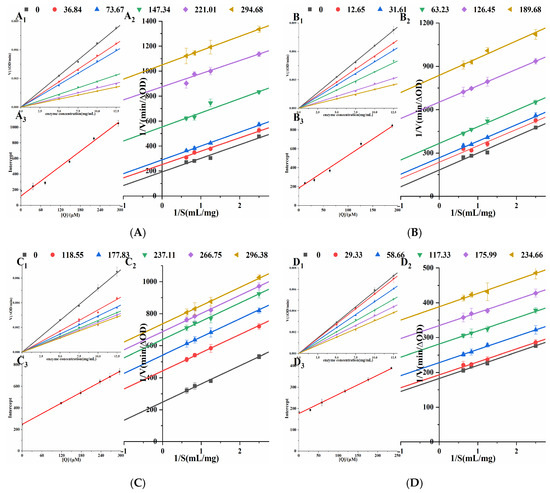 The concentration of PL was fixed at 5 mg/mL, and the concentration of the substrate 4-nitrophenyl laurate was changed (0.40, 0.80, 1.20, 1.60 mg/mL). By analyzing the relationship between the concentration of different substrates and the reaction rate of the enzyme, the Lineweaver–Burk double reciprocal curve was plotted to determine the inhibition type and calculate the inhibition constant.