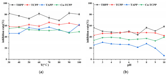 Four porphyrin compounds showed no significant change in the inhibition rate of PL in the temperature range of 30~100 °C (Figure 5), which indicated that they had good thermal stability in a short period of time. THPP, TCPP, and Cu-TCPP had a wide range of pH tolerance, and the inhibitory activity changed little between pH 2.0~10.0 (Figure 5). The inhibitory activity of TAPP changed little between pH 2.0~9.0. Four porphyrin compounds had higher inhibitory activity under weak alkaline conditions than under acidic conditions. The inhibitory activity of temperature treatment was higher than that of acid-base treatment at the same concentration.
