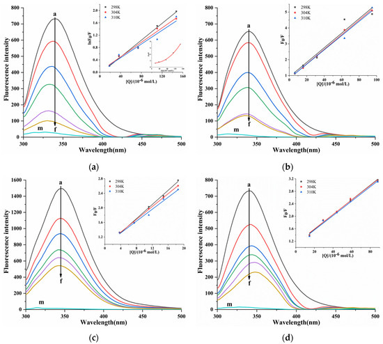 The method [41] of Li et al. was referred to and appropriate changes were made. A series of concentrations of porphyrin compounds were mixed with pancreatic lipase (5 mg/mL) at a volume ratio of 1:1 and incubated at 298, 304, and 310 K for 5 min. The excitation wavelength of the Hitachi fluorescence spectrometer F-7000 (Shimadzu, Japan) was set to 280 nm, the slit width was set to 5 nm, and the scanning range was set to 300–500 nm. In order to eliminate the influence of ‘internal filtering effect’ [42], the following formula is used for correction. , where Fcor and Fobs are the corrected fluorescence intensity and the experimentally measured fluorescence intensity, and Aex and Aem are the UV absorption values of the system at the excitation and emission wavelengths, respectively.