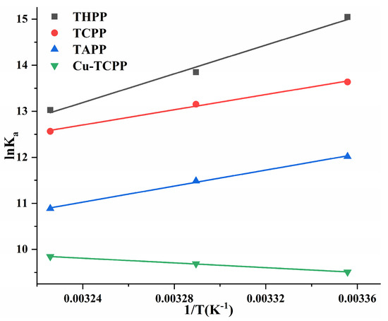 The relevant thermodynamic parameters were calculated by Equations (6) and (7), and the Van’t Hoff curves of four porphyrin compounds and enzymes were obtained:
